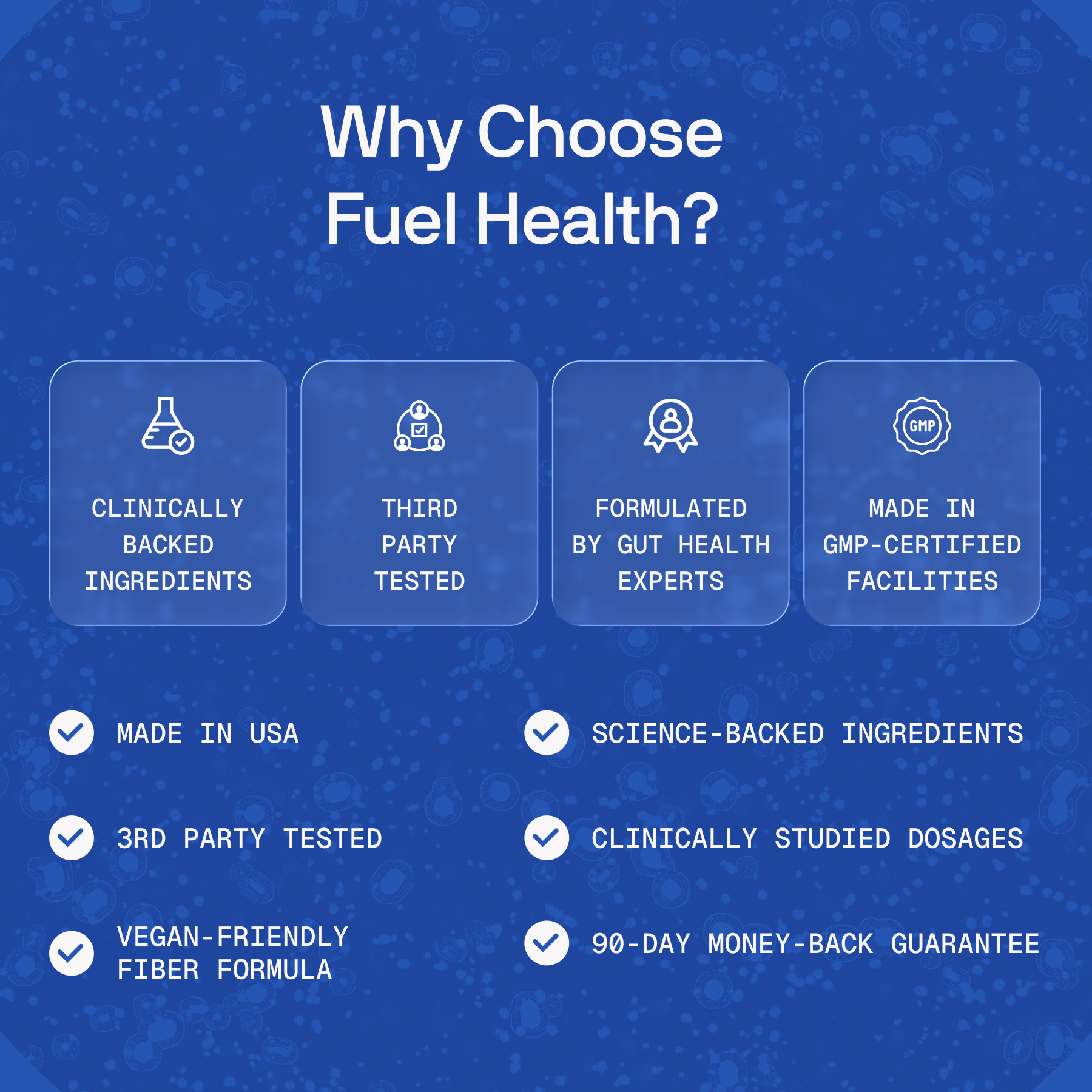 Disclaimer: These statements have not been evaluated by the Food and Drug Administration. This product is not intended to diagnose, treat, cure, or prevent any disease. The information on this site is not intended or implied to be a substitute for professional medical advice, diagnosis or treatment. All content, including text, graphics, images and information, contained on or available through this web site is for general information purposes only. FUEL Health makes no representation and assumes no responsibility for the accuracy of information contained on or available through this web site, and such information is subject to change without notice. You are encouraged to confirm any information obtained from or through this web site with other sources, and review all information regarding any medical condition or treatment with your physician.