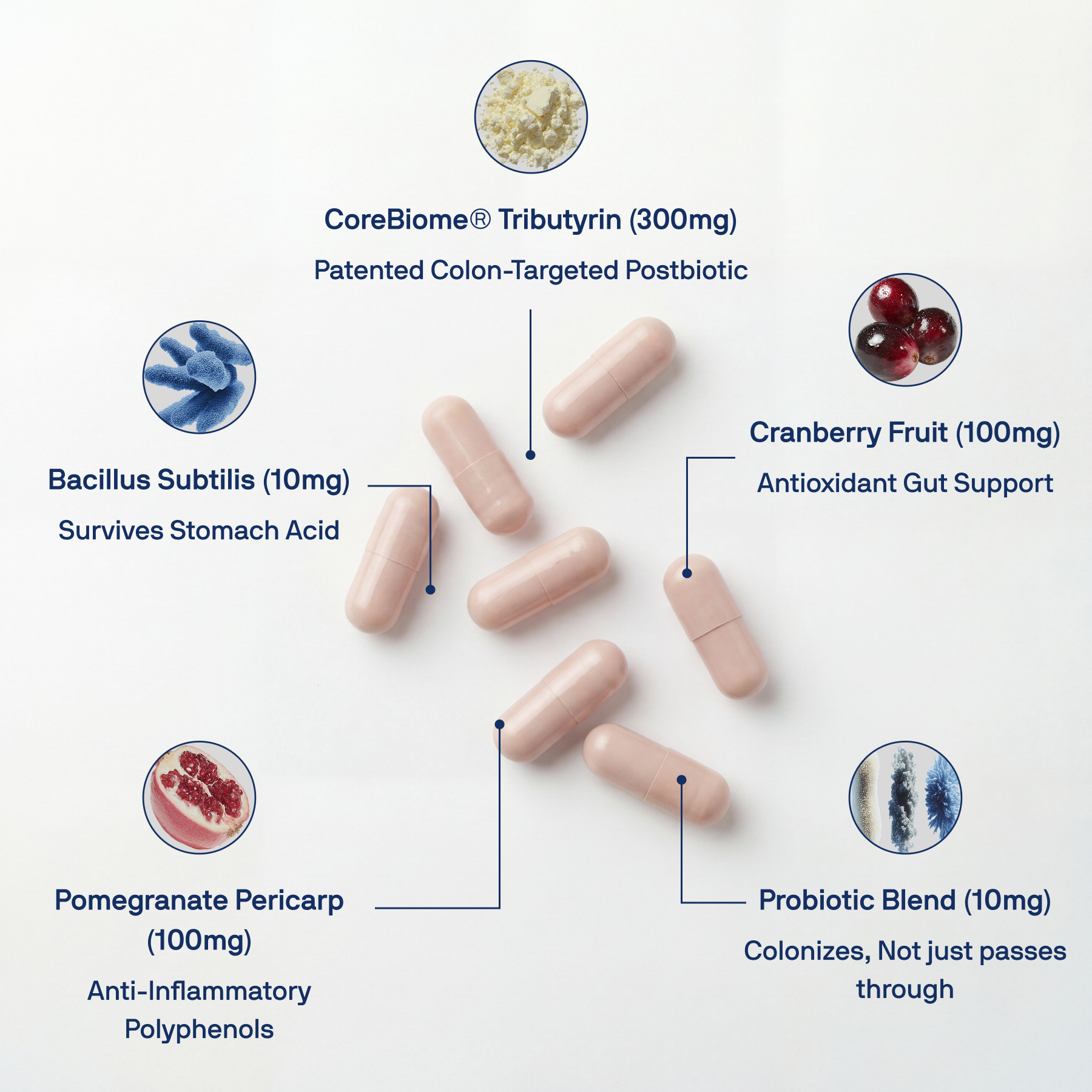 Daily TriBiotic uses CoreBiome® Tributyrin... a patented triglyceride form that resists stomach acid and delivers 51-59% of its butyrate directly to the colon. Published research in Frontiers in Nutrition (2025) confirmed this. Once there, CoreBiome strengthens tight junction proteins (the "mortar" between gut lining cells), calms inflammation, enriches beneficial bacteria, and triggers a positive feedback loop where your gut starts producing its own butyrate.