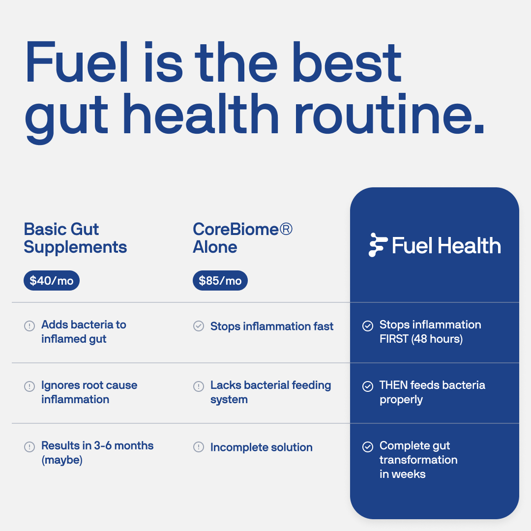 FUEL works best with consistent daily use. Your gut needs ongoing support to maintain the rebuilt barrier and keep bacteria properly fed. Most people notice that stopping supplementation gradually returns symptoms as the gut environment shifts back. Think of it like this: You wouldn't stop brushing your teeth once they're clean. FUEL maintains your gut's foundation.