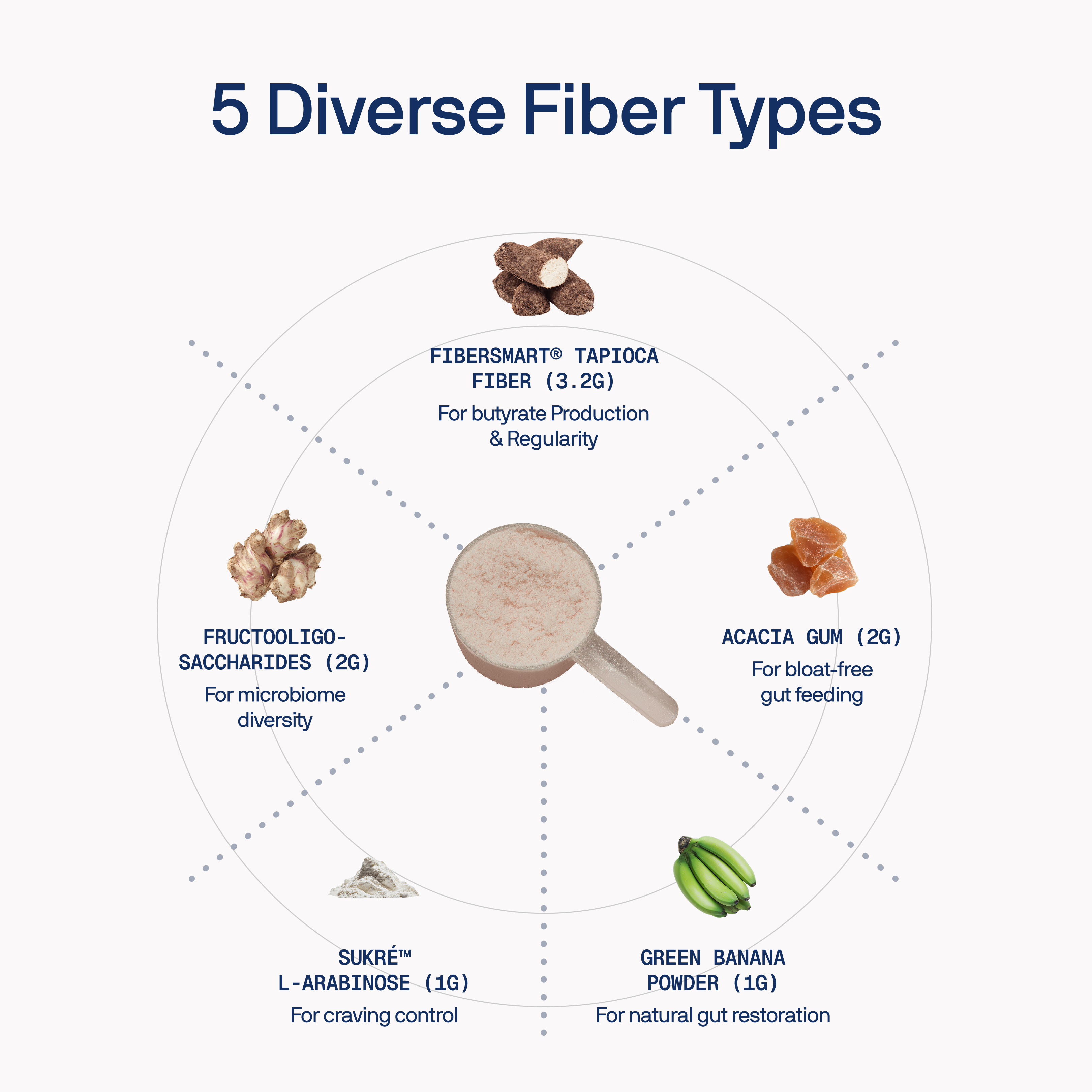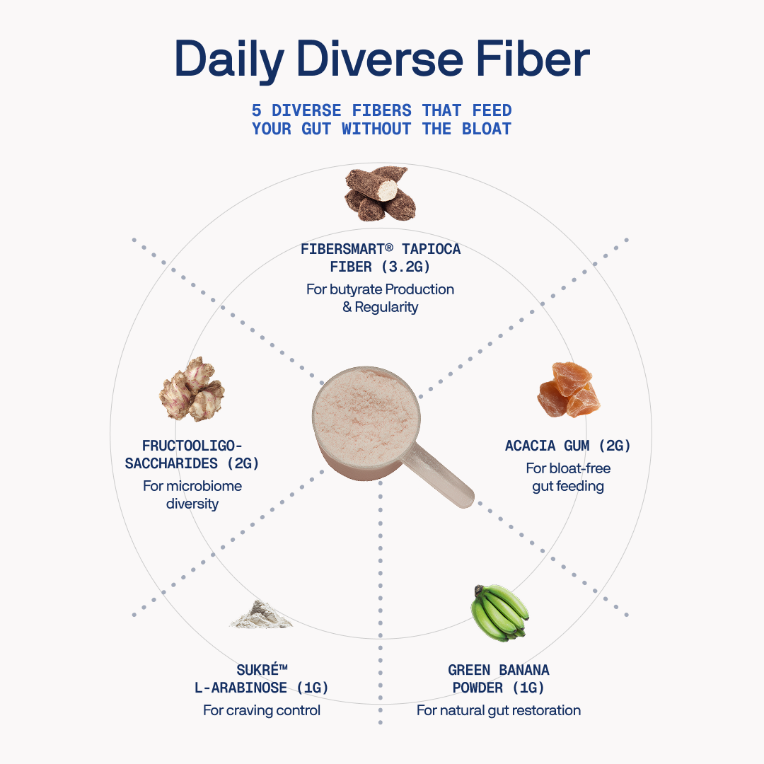 Your gut bacteria are diverse—they need diverse food. Each fiber type feeds different bacterial species: Tapioca fiber provides slow fermentation and is gentle. Acacia gum feeds bifidobacteria. FOS enables rapid butyrate production. Green banana provides resistant starch for the colon. L-arabinose offers prebiotic and glycemic support. One fiber feeds one group of bacteria. Five fibers provide complete microbiome nourishment.