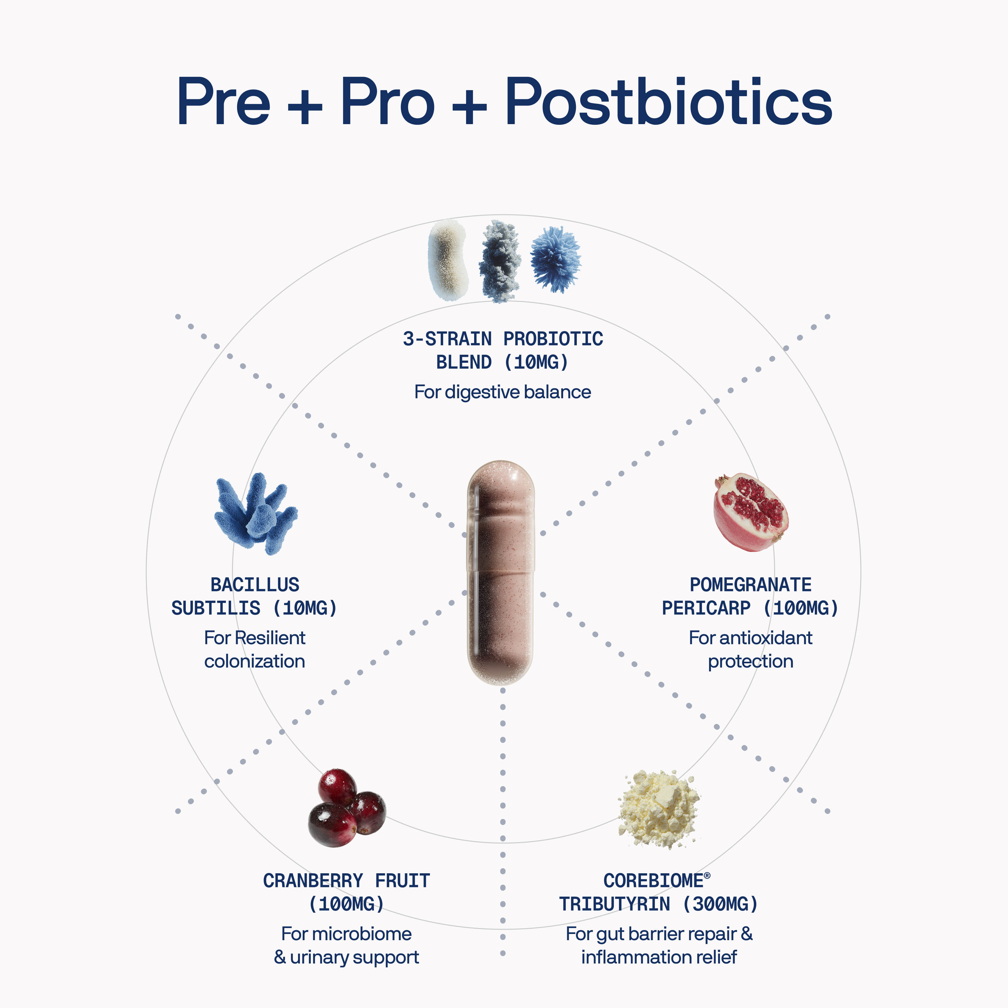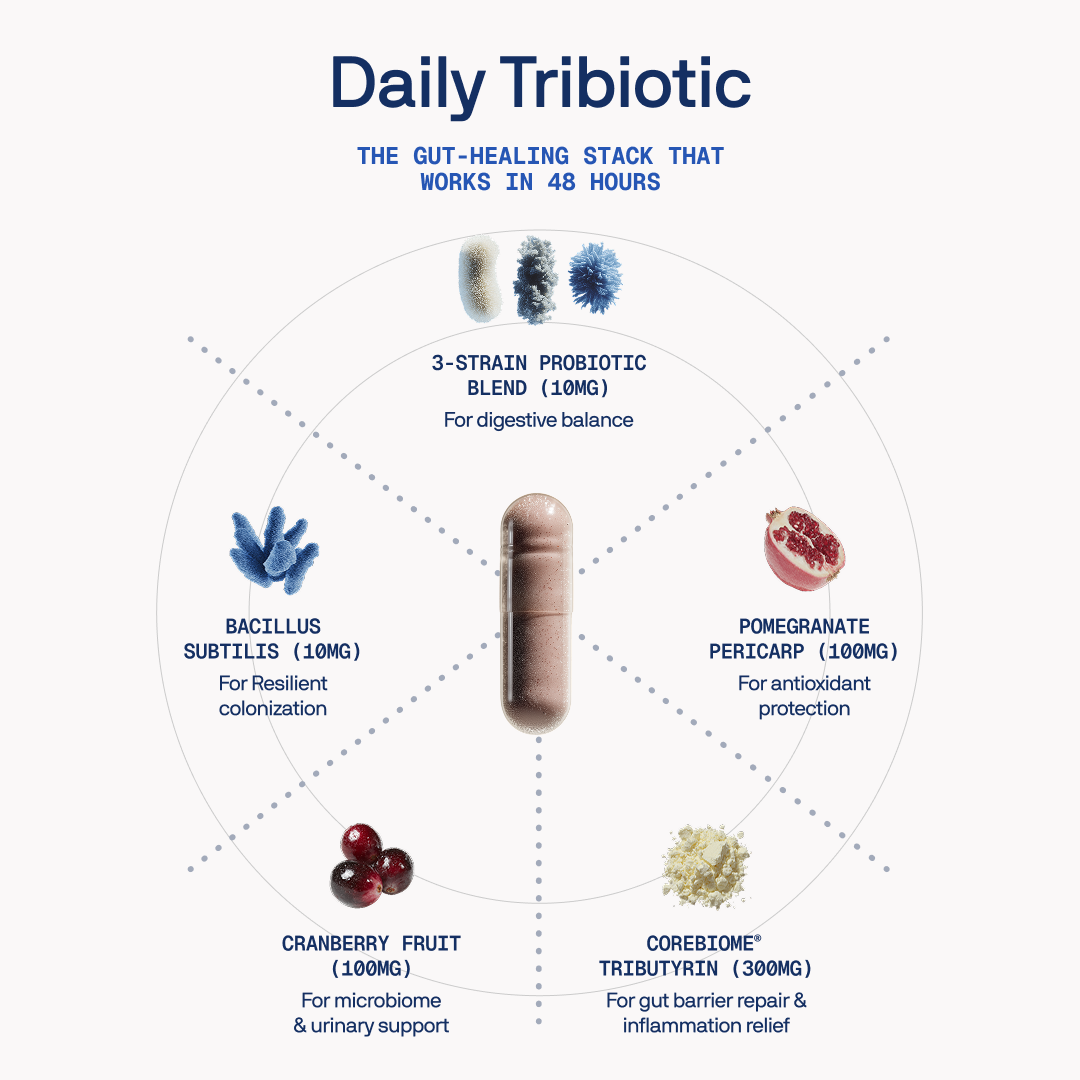 Our Daily Tribiotic is a combination of Prebiotics, Probiotics and Postbiotics containing CoreBiome®, the world's first fermented butyrate that stops gut inflammation within 48 hours