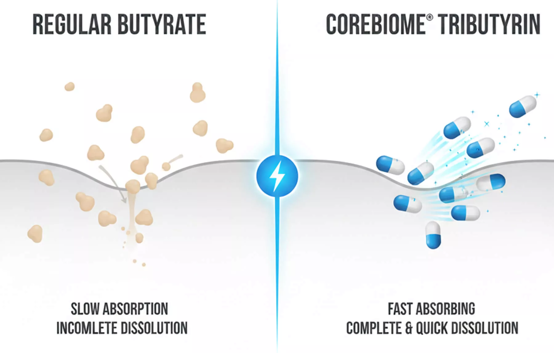 It gets absorbed in your small intestine, never making it to where the damage actually is. Plus, it smells like rancid butter mixed with old gym socks. The research I found was about something different. A fermented tributyrin called CoreBiome®. The first and only fermented butyrate in the world—made in the USA, not chemically synthesized.